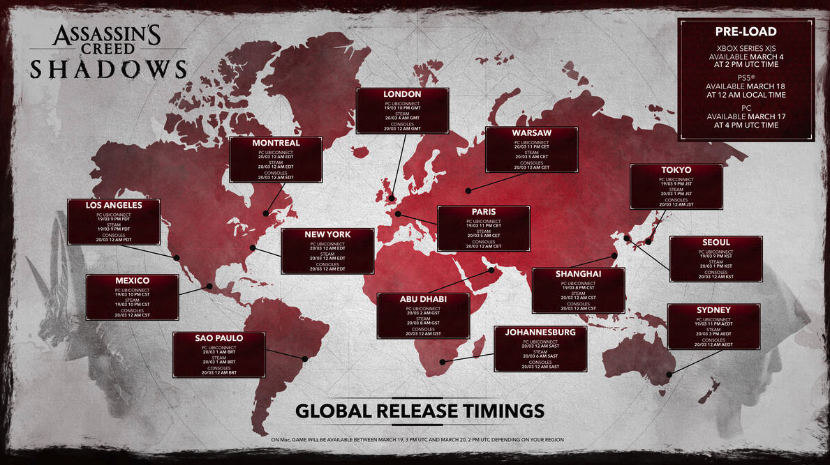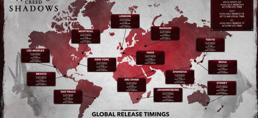 Игра Assassin’s Creed Shadows выйдет 20 марта, и Ubisoft объявила точное время запуска игры по всему миру. Также было объявлено, что предварительная загрузка Shadows уже началась на Xbox и скоро начнется на PS5 и PC.