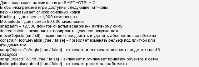 В The Sims 1 читов гораздо меньше, чем в The Sims 4. Хотя в оригинальной игре есть множество кодов для технических настроек, полезных читов относительно немного. Вот основные из них: