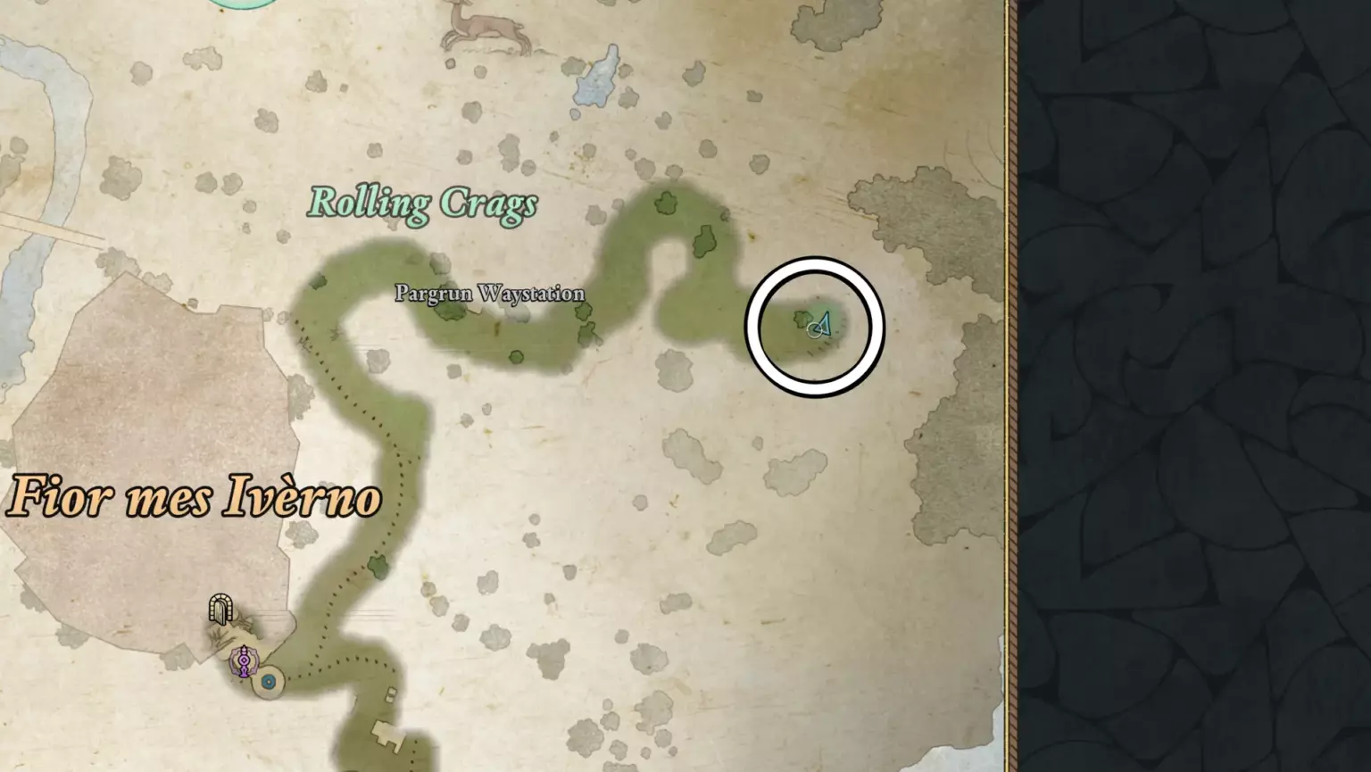 Сокровище спрятано на скале с видом на реку к юго-востоку от Диких Лесов. От лагеря Окраины Диких Лесов нужно двигаться на юг к реке. Возле водопада есть небольшой деревянный забор, под которым на утесе расположен маленький лагерь с мольбертом. В сундуке там можно найти уникальный предмет под названием “Кисть художника”. Лагерь находится над водопадом и к северу от Руин Безбожных Корней.