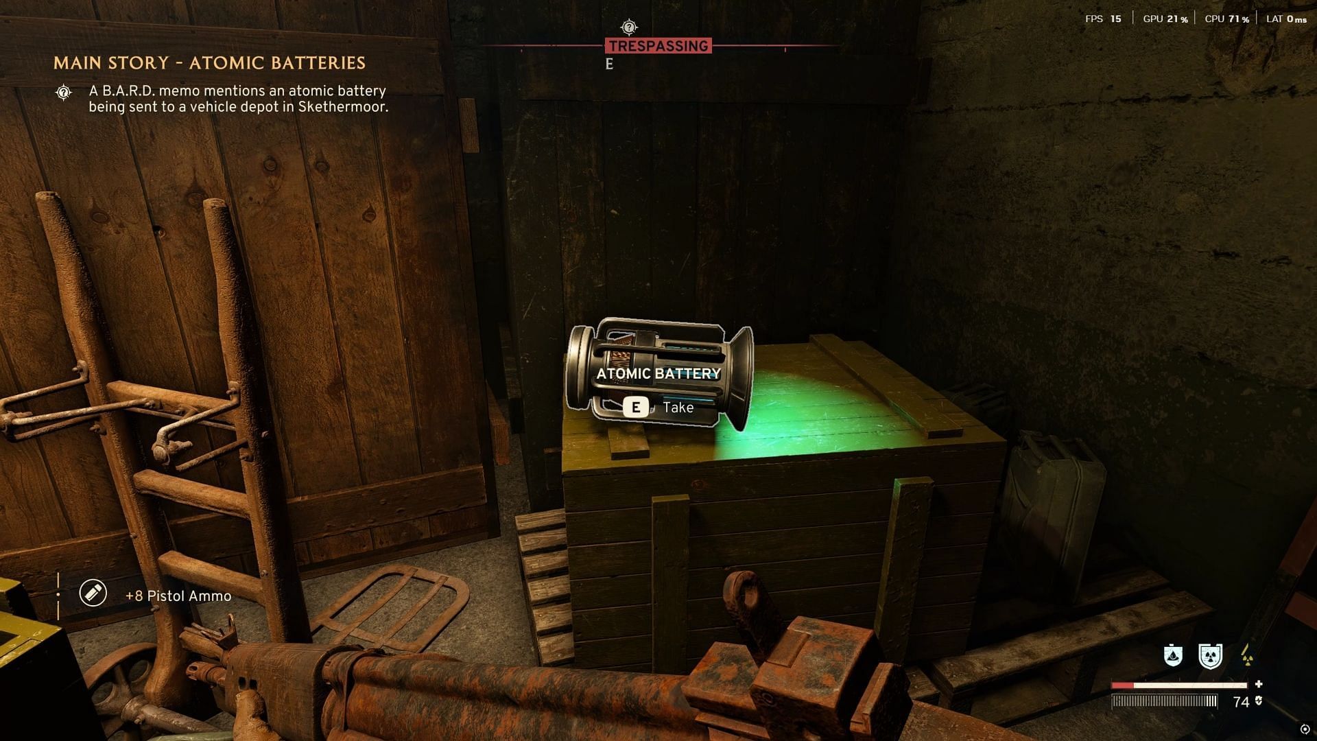 Одну легкую атомную батарею можно найти рядом с телом работника в защитном костюме внутри Процессорной комнаты в Развязке. Батарея лежит рядом с работником на верхнем этаже Процессорной комнаты, и вы можете использовать ее немедленно, продвинувшись немного дальше в Развязку, но подробнее об этом далее в этом руководстве.