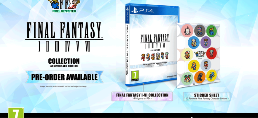 Выпущенное в октябре издание Anniversary Edition для Switch и PlayStation включает наклейки с пиксельными спрайтами персонажей Final Fantasy. Важно отметить, что это полноценный физический релиз – все шесть игр Final Fantasy Pixel Remaster находятся на картридже Switch или диске PS4 (полностью совместимом с PS5).