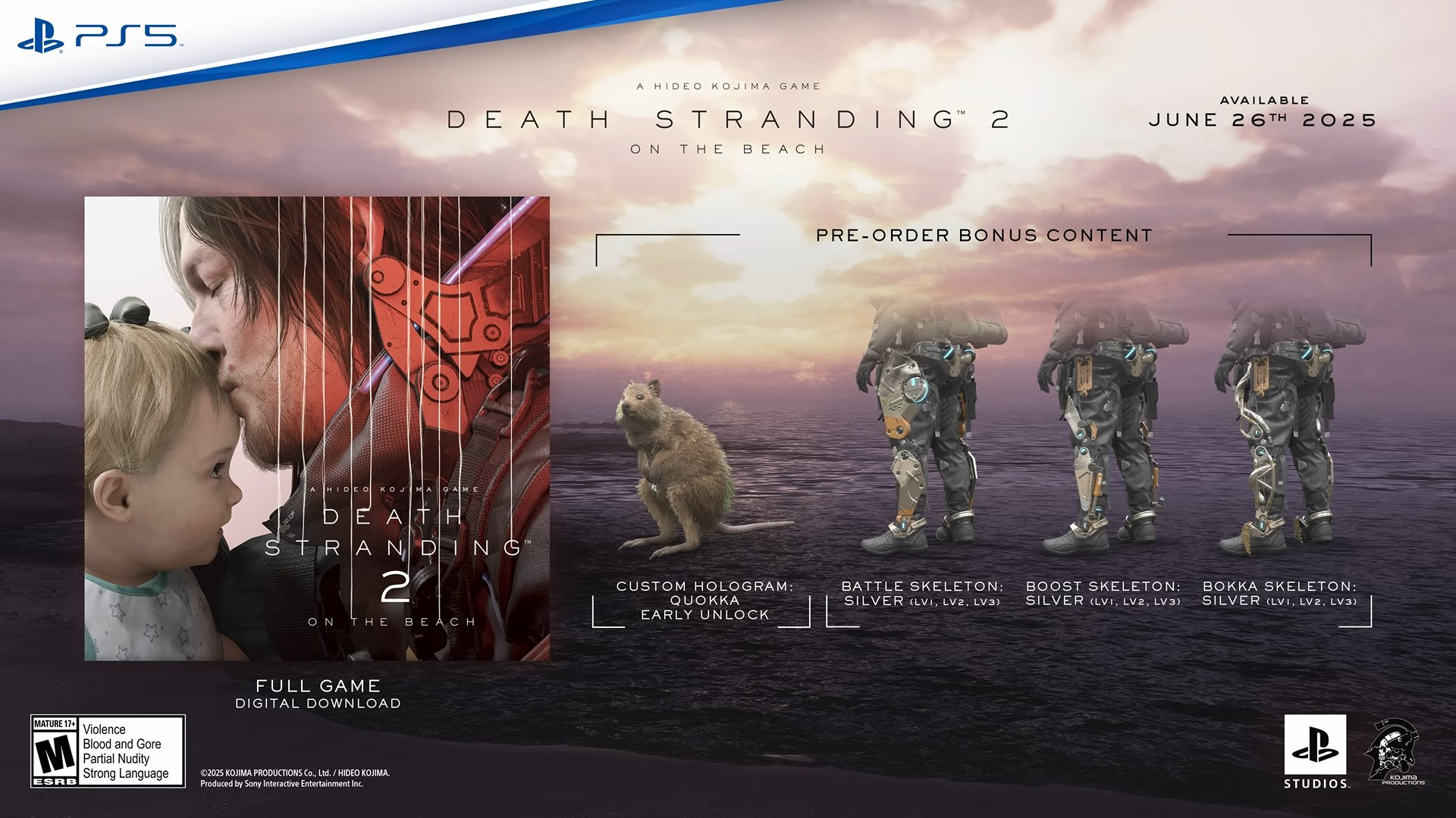 Предзаказы на Death Stranding 2 откроются 17 марта, и для покупки будут доступны три издания игры. Стандартное издание эксклюзива для PS5 стоит 70 долларов, также есть Digital Deluxe версия с несколькими внутриигровыми бонусами для скачивания и ранним доступом на два дня. Также будет Коллекционное издание за 230 долларов, в которое входят художественные открытки, фигурка Dollman, DLC, письмо от Хидео Кодзимы, 38-сантиметровая статуя Магеллана, нашивки и ключ для цифровой загрузки игры.