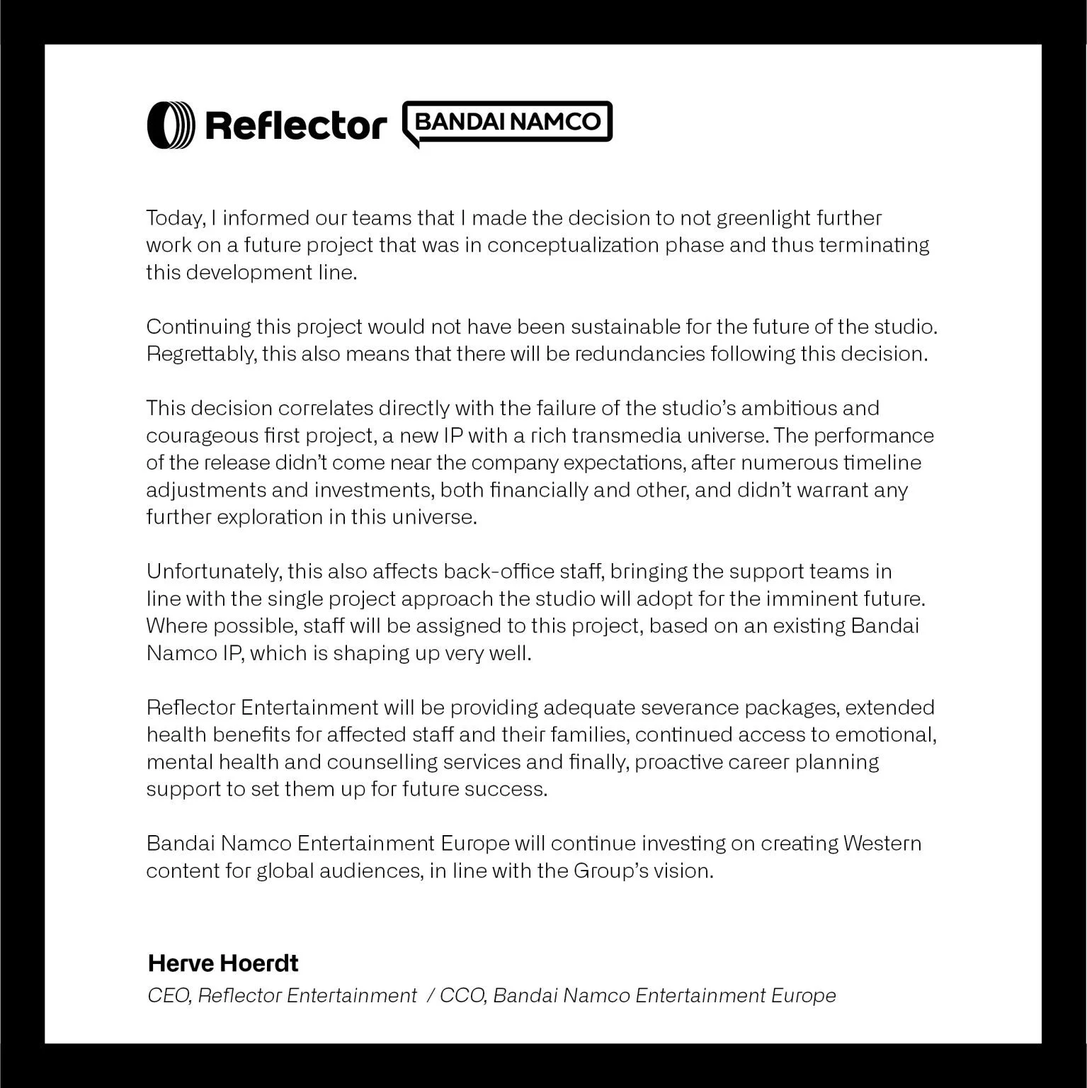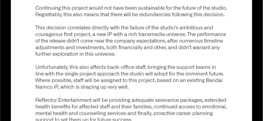 В ближайшем будущем Reflector Entertainment сосредоточится на разработке одного проекта. Часть сотрудников будет переведена на работу над существующей интеллектуальной собственностью Bandai Namco. Ранее запланированный проект отменен из-за экономической нецелесообразности, что приведет к сокращению штата. Уволенным сотрудникам будут предоставлены выходные пособия и продленные медицинские льготы.