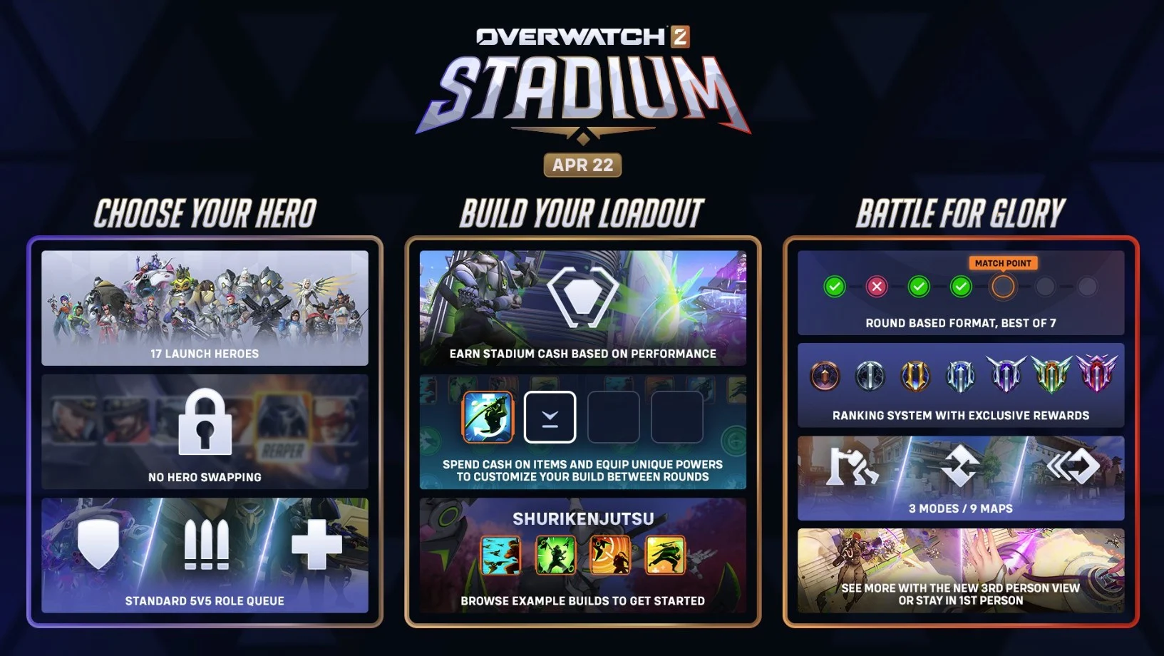 Команды из пяти человек — один танк, два героя поддержки и два героя урона — сражаются в течение семи раундов. По окончании каждого матча вы сможете усилить своего героя, выбрав новые умения, оружие и экипировку. В блоге и трейлере режима “Стадион” Blizzard привела несколько примеров, включая способность Райнхардта создавать лаву на поле боя ударом молота, клонирование Кирико и запуск Мойрой трех биотических сфер вместо одной. Система умений позволит игрокам выбирать улучшения, которые, по их мнению, будут наиболее эффективными. Blizzard также предложит несколько готовых вариантов сборок.